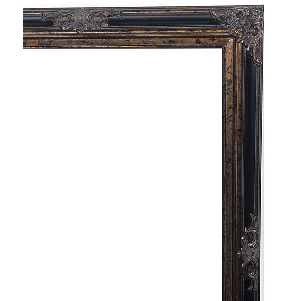 Interior size is 24 x 36 with an overall exterior dimension of 30 x 42 with a profile width of 3 and a profile height of 2 . Our Mini Grand Victorian frame is traditional designed frame made in solid wood with classic compo corner ornamentation and wood liner. The frame is finished in an antique black with contrasting antique gold leaf moldings and accents. The frame has a very authentic old world look and feel. A FRAMERS CHOICE SELECTION !!!