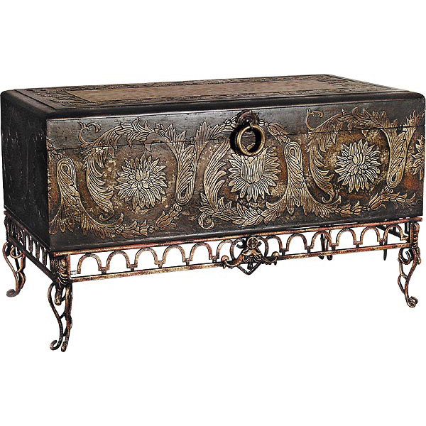 Scrolled leaf and flowers in relief are richly treated in gold and burnished finishing on AFD Home's Flora Carved Trunk. This finish is also applied to the hand-wrought iron stand. A great looker - this piece also presents at tabletop height for holding