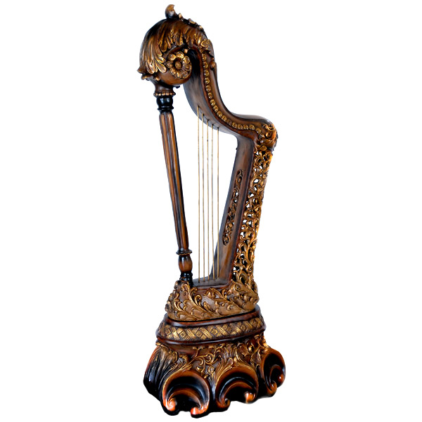 At 58.5 tall the Illuminated harp shown is quite a unique decorative item. It is a functional Object of art as it is illuminated at the top of the base and light emitts throughout the peirced design highlighting the details carved throughout the shaft of the harp. It will be a conversation inspiring item as it creates an attractive glow in the area it is displayed. The original was hand sculpted by the artist. It is now hand cast in 2 parts the harp top and the base in long lasting fiber Poly resin. The base is fitted with a Ul listed Light assembly and cord which runs from under base with a switch for operation. The finish is a hand applied wood tone with gold antique highlights showcasing the details.