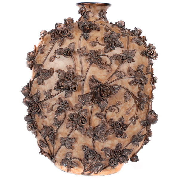 At 17 wide and 22 tall this is a gorgeous vase offerred from our popular Secret Garden Collection. This item is artist designed and carved with beautiful and dramtically raised all over details of roses and vines. The finish is a soft and beautiful tone of amber ecru with hand applied contrasts and antique rubs to the details creating beauty and depth. Hand cast in resin. Often ordered in pairs for balance and a larger symetrical decor application. This item also pairs beautifull with either the matching set of candleholders jewelry boxcharger or larger vase from same collection.