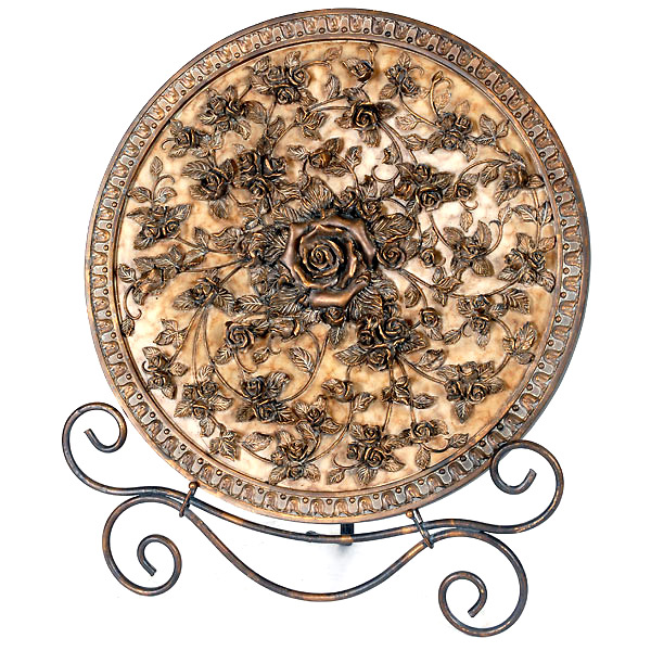 At 20 diameter charger that comes with a wrought iron decorative stand which raises the display to 22 tall from our popular Secret Garden Collection. This item is artist designed and carved with beautiful and dramtically raised all over details of roses and vines. The finish is a soft and beautiful tone of amber ecru with hand applied contrasts and antique rubs to the details creating beauty and depth. Hand cast in resin and iron. This item pairs beautifully with either the matching set of candleholders jewelry box or vases from same collection