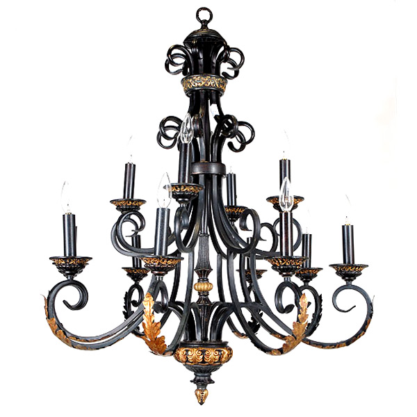 This chandelier style is wide ranging and will fit into many styles of homes from classic Amercian style Mediterranean Western or Traditional. A 33.5 Diameter X 41.5 Tall 12 light Forged Iron with Polystone Cast Ornamentation The chandelier is Ul Listed and uses qty 12. . . E 12 Candelabra bulbs up to a maximum 25 watt per bulb Chandelier comes fully assembled in box . Bulbs are not included .