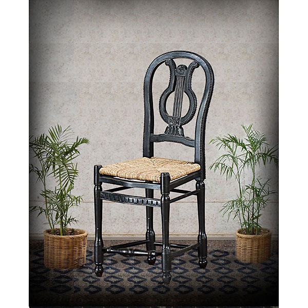 A popular selling and beautifully hard carved Lyre Counter Stool - BK from our Heritage Collection. A collection offering turn of the century styling designed and scaled to showcasing American Standards. The counter stool offers a traditional lyre back design with delicate hand carved framing on both front and back with classic rush seats. The rush seats are appropriate to the style of the design yet customers might prefer to also use tie back seat cushions ( not included) to further compliment the desired setting. The counter stool shown is finished in our elegant Black Finish (BK) and our sold separately. The seat height of these chairs make these appropriate for gathering height tables or conventional kitchen counter use for a taller Bar height application order the Lyre Bar Stools-BK. The Heritage Collection is a fine hand made furniture collection in the purest of standards of age old traditional crafting. Each piece is hand carved one piece at a time by some of the worlds best carvers. The special Mahogany wood used comes from replanted forests the selected wood has been kiln dried. The item in its final form is stress and pressure tested prior to finishing to insure long lasting stability in most all climates a Heritage Brand standard. The final steps of hand making furniture is the application of the hand applied finishes. The specialty finishes used combine hand applied layering glazing padding distressing and crackling techniques and complete the beauty and value of owning timeless Heritage Furniture a quality that will last for generations of ownership. Made by hand and imported from Indonesia.