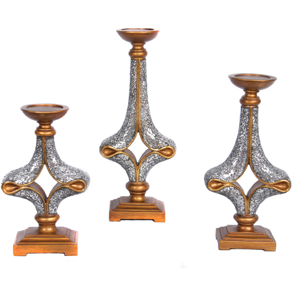 A popular set of 3 Candleholders each designed with a graduated hieght for a more interresting display of 18 14.5 and 12 tall. The set is from our Lavaliere collection a modern design featuring a hand applied micro mosaic mirror veneer with contrasting grout. They are artistically designed and cast in resin and also feature gold contrasting accents. This set would group nicely with the vase or photo frames from the Lavaliere collection.
