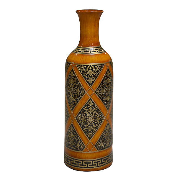 At 36 tall this is large vase and suitable for floor display. Hand cast with carved details in porcelain and hand finished in contrasting tones of blacks golds and browns.