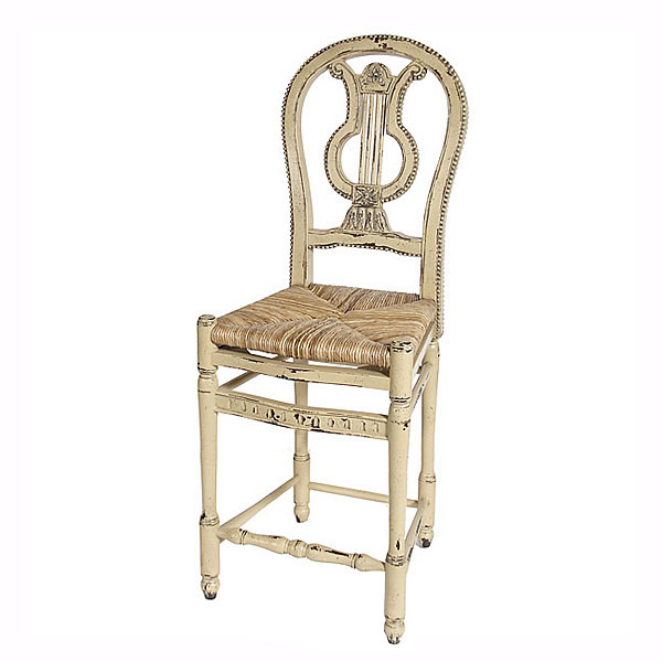 A popular selling and beautifully hard carved Lyre Barstool - PM from our Heritage Collection. A collection offering turn of the century styling designed and scaled to showcasing American Standards. The barstool offers a traditional lyre back design with delicate hand carved framing on both front and back with classic rush seats. The rush seats are appropriate to the style of the design yet customers might prefer to also use tie back seat cushions ( not included) to further compliment the desired setting. The Barstool stool shown is finished in our elegant Parchment Multi (PM) and our sold separately. The seat height of these chairs make these appropriate for conventional Bar height application typically 42 to 44 bar counters. For a lower seating application in this same style consider the Lyre Counter Stools-PM or the Lyre Dining Chairs-PM. These seating options will pair nicely with any of the other items in the Heritage (PM) finish series. The Heritage Collection is a fine hand made furniture collection in the purest of standards of age old traditional crafting. Each piece is hand carved one piece at a time by some of the worlds best carvers. The special Mahogany wood used comes from replanted forests the selected wood has been kiln dried. The item in its final form is stress and pressure tested prior to finishing to insure long lasting stability in most all climates a Heritage Brand standard. The final steps of hand making furniture is the application of the hand applied finishes. The specialty finishes used combine hand applied layering glazing padding distressing and crackling techniques and complete the beauty and value of owning timeless Heritage Furniture a quality that will last for generations of ownership. Made by hand and imported from Indonesia.
