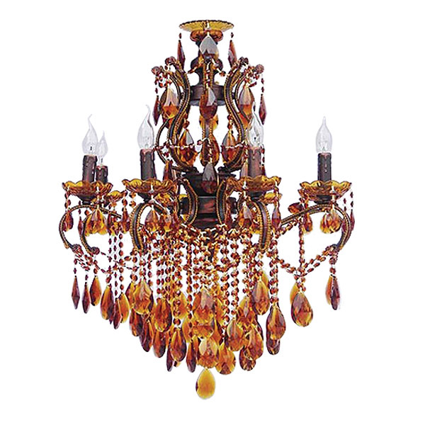 The Echallen Chandelier has a 25 Diamter X 34 Tall. The Chandelier is a top seller offering a very rich appearrance and made popular for its warming iluminated glow of Amber colors. The Chandlelier is constructed in Forged Iron Crystal and Glass. It offers undulating forged iron arms uniquely lined in Amber colored cabachons beads . The Chandelier is fully dressed with Amber colored Crystals. It features 8 lights and each light holds up to a 15 Watt E12 standard Candelabra bulb sitted in a decorative amber glass Bobache. Bulbs are Not Included. It is UL Listed. The Chandelier comes fully assembled in box but requires hanging of crystal and when fully dressed weighs 25.15 lbs. The Echallen Chandliers is also offerred in a larger size consider the Grand Echallen Chandelier 35 Diameter x 45 Tall and customers may also consider the beautiful Echallen Candelabra Lamp.