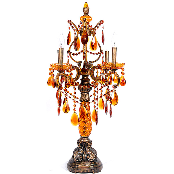 The Echallen Candelabra Lamp has a 19 Diameter X 34.5 Tall. The Lamp is a top seller offering a very rich appearrance and made popular for its warming iluminated glow of Amber colors. The Lamp is constructed in forged Iron Crystal and Glass. It offers undulating forged iron arms uniquely lined in Amber colored cabachons beads . The Chandelier is fully dressed with Amber colored Crystals. It features 4 lights and each light holds up to a 25 Watt E12 standard Candelabra bulb sitted in a decorative amber glass Bobache. Bulbs are Not Included. It is UL listed. The Lamp comes fully assembled in box but requires hanging of crystals and when fully dressed weighs 16.72 lbs. The Echallen Candelabra Lamp coordinates beautifully with the matching Echellan Chandleiers also offerred. Consider the Echallen Chandelier or the larger Grand Echallen Chandlelier.