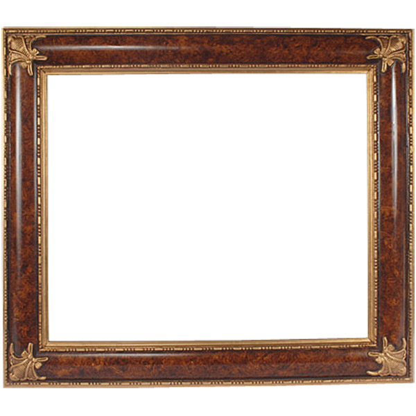 Interior size is 24 x 36 with an overall exterior dimension of 31 x 43 with a profile width of 3.5 and a profile height of 1.75. Our Elegant Burl and Gold Frame is a clean transitional frame with a hand applied faux burl center and antique gold leaf finish accenting all the ornamentation and defining the liner. The frame is made in solid wood with compo corners.
