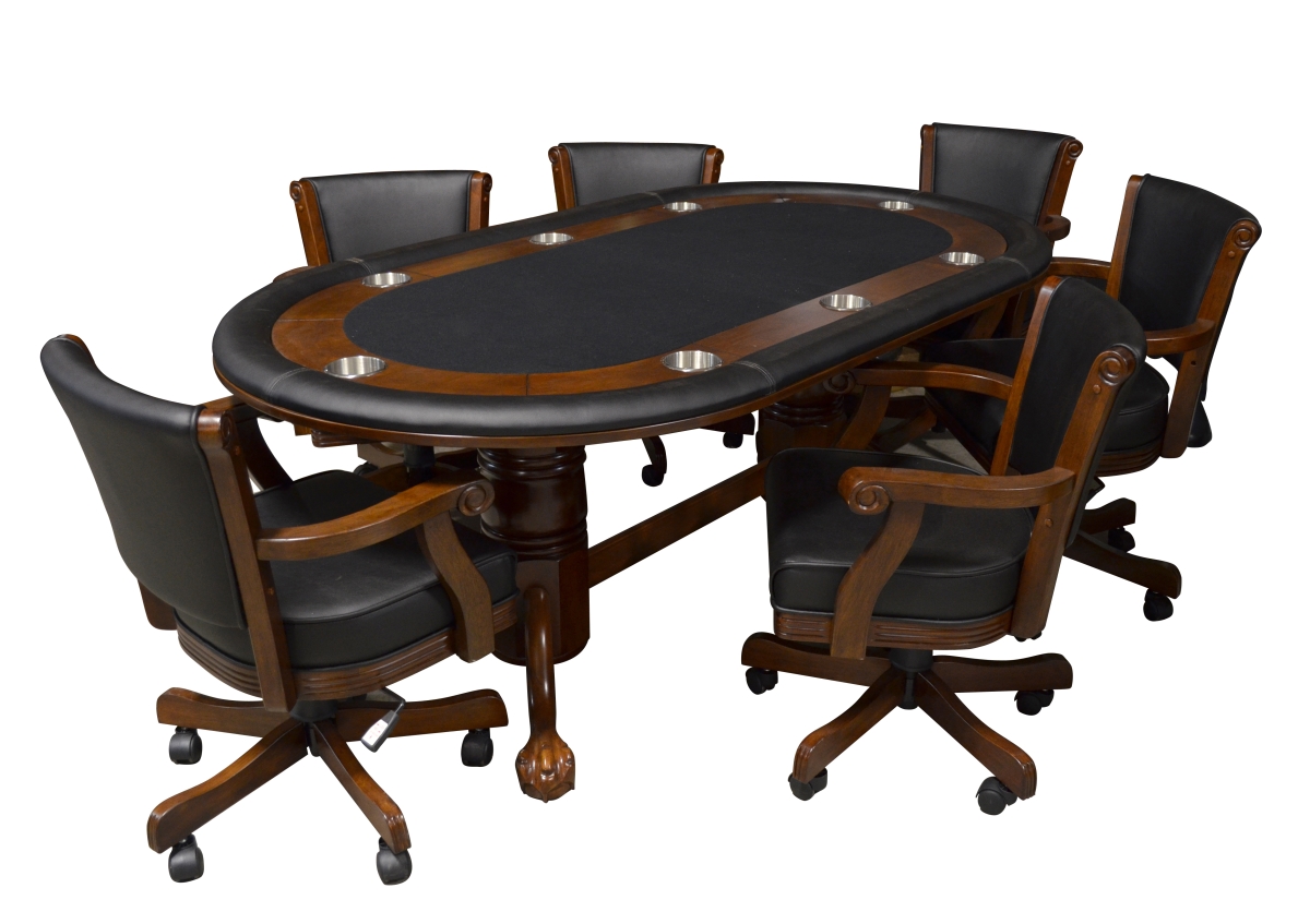 Your friends and family will enjoy all that this dining/gaming table and chair set offers. Introducing our Maverick Oval Game Table with 6. . . . Maverick Swivel Game Chairs the complete set. The Maverick Oval Game Table is a popular multi functional gaming table that combines a larger oval dining function with removable a top that covers a professional style card or poker table. The table has many popular features included such as; a complete padded arm rest edge an inset race track shaped wood chip rail with drink holders and a black velvet playing surface. The chairs offer 1) a reclining back with position able lock feature 2) a full swivel rotation 3) a lift for seat height adjustments and 4) comes on durable caster wheels for ease of mobility. The wood on the table and chairs come in a rich dark cherry finish and the chair seat back and cushions are covered in a durable black polyurethane. Some assembly required.