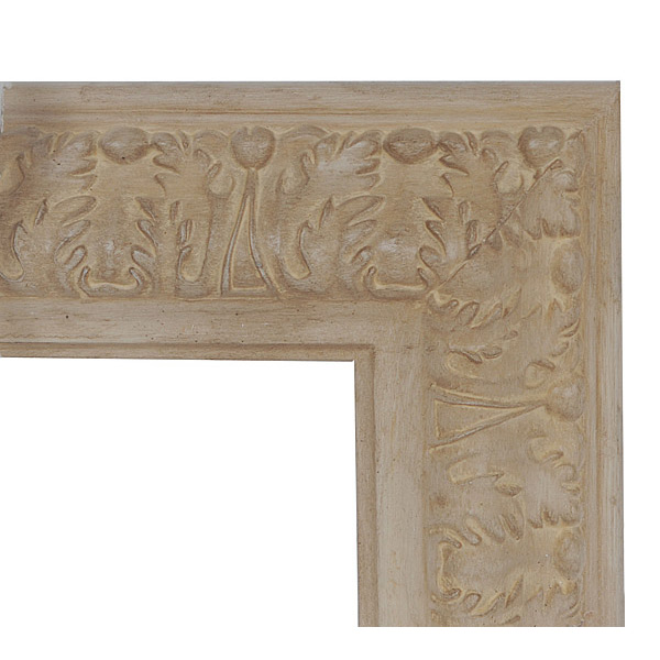 Interior size is 30 x 30 with an overall exterior dimension of 38 x 38 with a profile width of 3.5 and a profile height of 2.25 . Our Acanthia Ecru Frame is an elegant designed frame. The frame features a classic all over acanthus leaf detail. The frame is made in solid wood with framers compo applied ornamentation. The hand finish is a very soft French ecru finish with dry brush highlighting and a final French wash that fills and accents the leaf motif. A delicate lighter frame for applications requiring a softer look.