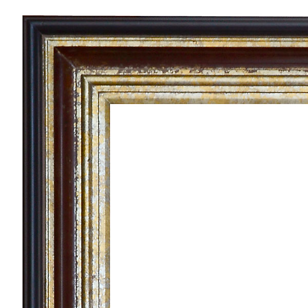 Interior size is 12 x 16 with an overall exterior dimension of 22 x 26 with a profile width of 5 and a profile height of 2.25 . Our Bardiloni frame is a classic Italian designed frame. The frame is made in wood with a hand finish of graduated colors from outside to in drawing the viewers eye inward. The outer edge has a dark outer side the deep inner scoop is finished in a mahogany burgundy wood tone defined by raised lighter bands The frame also features a shabeen treatment of variegated gold and silver and burgundy metal leafing. The distinct finishes used and popular profile combine to create a very interesting and well defined framing result.