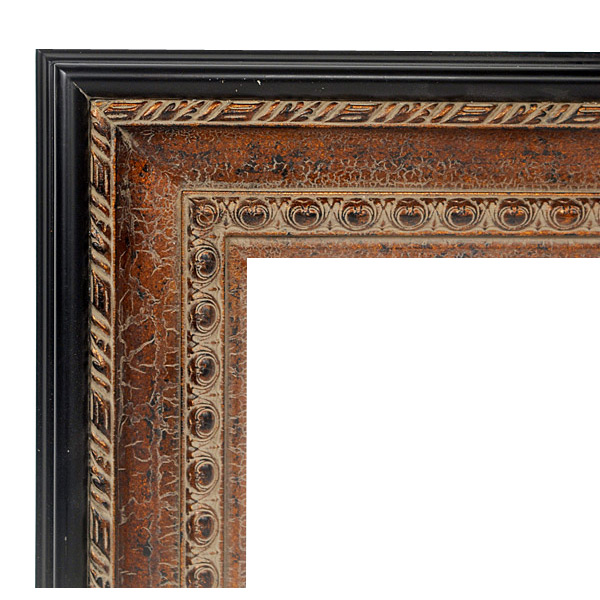 Interior size is 24 x 48 with an overall exterior dimension of 36 x 60 with a profile width of 6 and a profile height of 2.75 . Our Copper Black Sizzle Frame is a American designed frame. The frame is made in wood with a hand finish of blended tones of color from outside to in drawing the viewers eye inward. The outer edge is properly darkened defining the deep inner scoop which is finished in a very interesting antiqued black crackle affect over gold leaf. The frame is further detailed with classic framing elements of design. The distinct finishes used and popular profile combine to create a frame that can be used appropriately with a variety of subjects and fine interiors such as western Mediterranean traditional or classic.