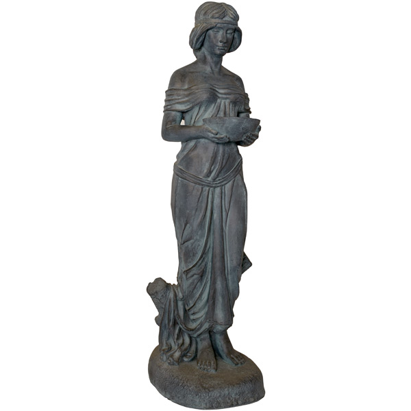 Our Stone Cast Standing Maiden features a full sculpture of a beautiful lady standing 39.5 tall. The scultpure is artist carved and hand cast in a durable fiber glass reinforced resin with a finely crushed stone outer surface giving them an authentic hand finished soft verde stone look and lasting quality. The scultpure has an additional light hand wash that binds into the details of the sculpture and accents the details. No assembly required. The material and finish are suitable for outdoor use. Note* all products used outside will naturally wear depending on conditions and may require maintenance.