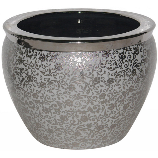 A large hand cast porcelain classic Fish bowl planter 18 wide x 13 tall in white porcelain body with and a silver plated crown. The artist by hand then stenciled a tasteful yet intricately detailed silver metal all over scroll design over the white giving depth and beauty and creating this pleasing overall affect.
