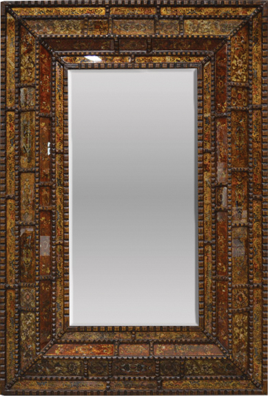Peruvian Reverse Sienna Mirror is 48 wide and 71 tall it features rich varying sienna and gold tones creating depth and contrast in this reverse painted art mirror. Set into an angled and mutli reflective carved frame design the technique used embodies an art form developed hundreds of years ago in the small villages of the Andes mountains. The artists were able to create colorful objects utilizing indegenous vegetable and plant based colors. The techniques evolved over the years from generation to generation and expanded to painting hides and pottery it was later discovered that by using this technique and by painting on the reverse side of glass that the colors and designs where even more beautifully magnified. Today they are even further enriched by backing the painting panels with gold and silver leaf foils. We offer many color options in these fine and very popular authentic Peruvian mirrors for you to choose from and while there are many copies created in less quality trying to copy the original techniques none are found as beautifull as those offerred under our Santa Lucia Collection. A hand made treasure and an investement in a quality art form to be cherished for generations to come.