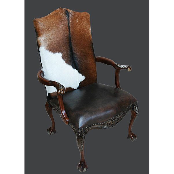 A very well defined and hand carved Chippendale Western Club Chair- VC from our Heritage Collection. A collection offering turn of the century European styling designed and scaled to showcasing American Standards. This beautiful chair took inspiration from Classic and Timeless Chippendale elements such as its claw and ball feet its goose neck curved arms and the traditional carved shells and scrolls. Thomas Chippendale was a London cabinet-maker and furniture designer his designs reflected the British fashion for furniture of that period and are reproduced globally even today. Then combining this style with a western flair with natural hides and top grain rich brown leathers makes this a very desirable unique chair option. The natural hides and leather compliment the elegant Vintage Estate (VC) finish a rich mahogany finish with a subtle grey wash rub used to accent and enhance the details. The chair comes fully assembled and as such is very sturdy. The Heritage Collection is a fine hand made furniture collection in the purest of standards of age old traditional crafting. Each piece is hand carved one piece at a time by some of the worlds best carvers. The special Mahogany wood used comes from replanted forests the selected wood has been kiln dried. The item in its final form is stress and pressure tested prior to finishing to insure long lasting stability in most all climates a Heritage Brand standard. The final steps of hand making furniture is the application of the hand applied finishes. The specialty finishes used combine hand applied layering glazing padding distressing and crackling techniques and complete the beauty and value of owning timeless Heritage Furniture a quality that will last for generations of ownership. Made by hand and imported from Indonesia.