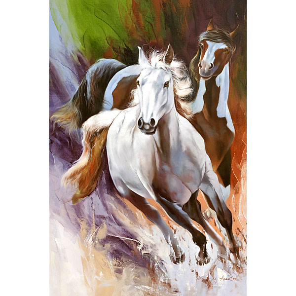Our Galloping Horses is a featured and dramatic interpretation of 2 gallant horses painted in a colorful abstract background adding to the overall timeliness of this subject with an effective balance of light uniquely evident in the style of this master artists work. It comes gallery wrapped and ready to hang. The finished image size is 24 x36 inches. A Le Beau Giclee is a Museum quality recreation of an original top artists' work on canvas by AFD. The techniques used are one of the most accurate forms of art reproduction today utilizing 100% archival inks and acid-free canvas. Each Le Beau Giclee is a masterpiece creation and are hand embellished by a professional artist in our studio to achieve the rich texture and depth of the final delivered artwork making it almost indistinguishable from the original oil painting. Now allowing some of the finest oil paintings to no longer be exclusive to museums and private collectors and often due to price making the most beautiful paintings ever created unobtainable for enjoying by others. A Le Beau Giclee will remain an heirloom piece with display time of well over 100 years.