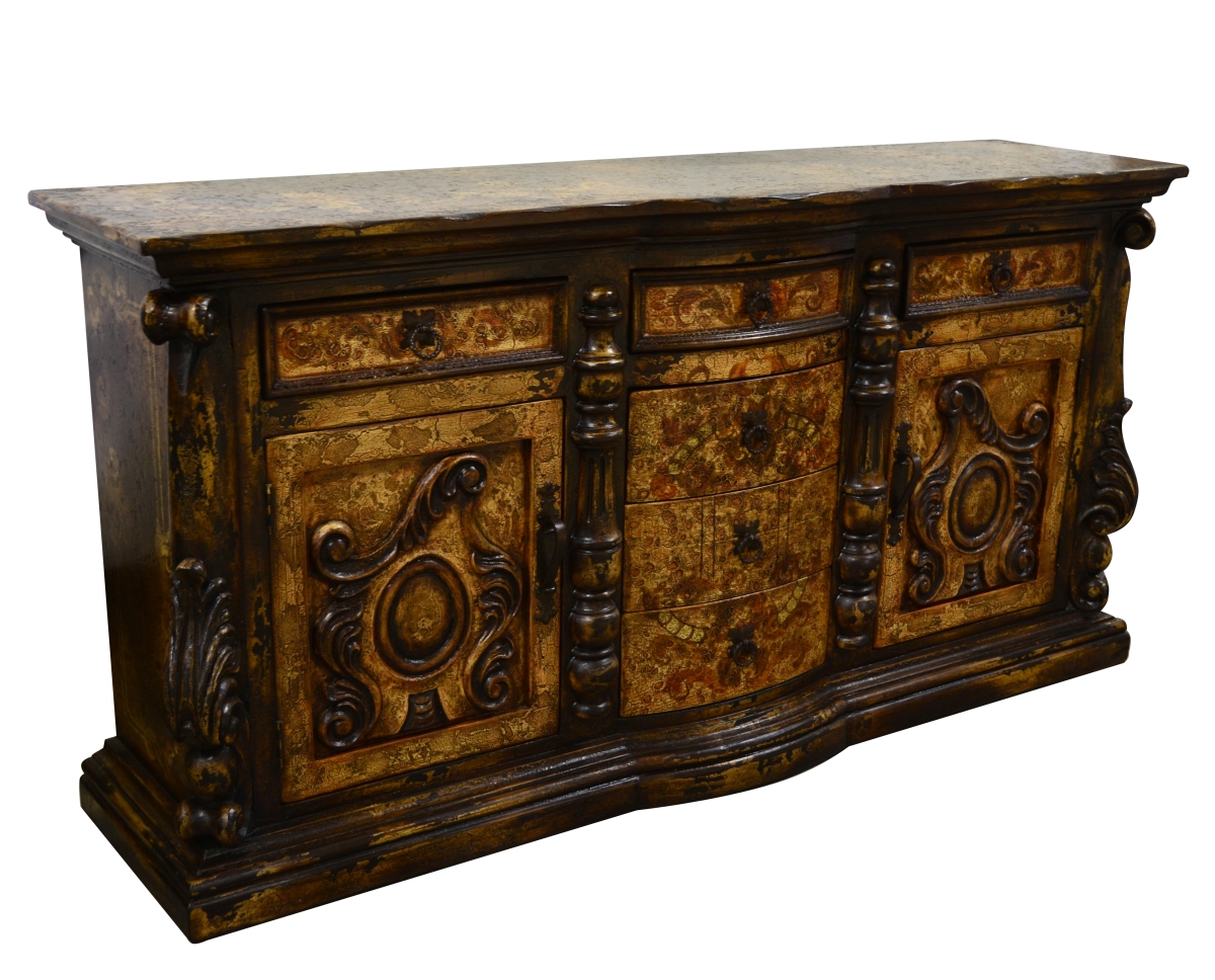 The Belruse Buffet at 84.25 wide and 42 tall is from our popular Belruse Series. This series boasts a Spanish influence with large scaled details and its multi layered finish of light and dark sienna and brown tones with subtle natural contrasts resulting from hand rubbing and exposing the rich wood undertones then delicately detailed with hand painted soft scrolls. There are many dramatic and beautiful buffets consolessideboards and cabinets offered in this Belruse series that are available in different sizes and shapes to enable you to find the perfect option. The Belruse series is part of our Santa Lucia Collection which consists of handmade hand painted and distressed solid wood furniture making each piece a timeless investment. Hand crafted treasures made one piece at a time under one roof by our exclusive family owned manufacturer from Lima Peru. Their master artisans are skilled in furniture making techniques influenced by the Spanish during the colonization of Peru. Many items in the diverse collection feature specialty hand painted finishes that have also been passed on and perfected from generation to generation. The family strives to be environmentally friendly by using woods re-purposed from haciendas and old colonial homes as well as wood indigenous to South American forests primarily mahogany cedar moena and requia. If you are a lover of beautiful painted furniture find hill country rustic romantic or find richness in Mediterranean lore Then you too may fall in furniture love with this fine collection.