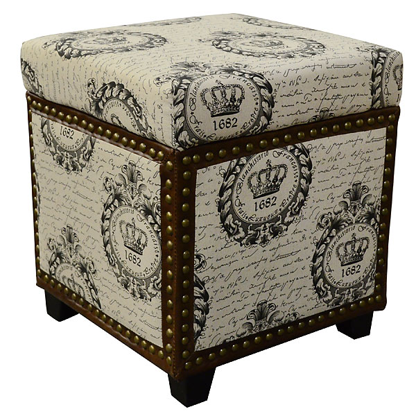 Dimensions: 16.5L X 17D X 19H Designed to give the appreance of an old shipping trunk - Decorative linen fabric exterior with accents of black leather straps and brass nailheads - wooden feet - a black interior with safety hinge