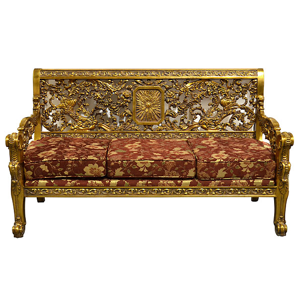Our Versaille Settee is 67 wide. It features classic scrollsleafs and shells of the period with a rich burgandy and gold floral fabric. The hand finish is done in antiqued gold leafing. The sette is made in wood with cast resin accents.