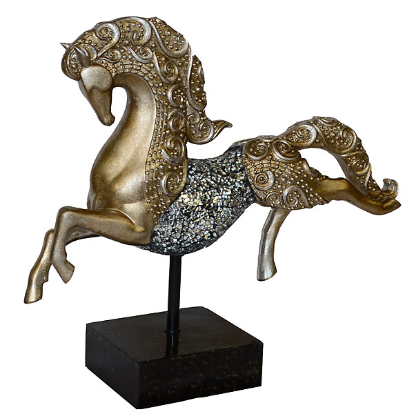 An artistic sculpture featuring a pagent horse on stand in a modern artistic interpretation featuring micro mosaic mirrored elements surrounded by a silver chiffon finish with golden hues. The item is hand cast in resin with iron stand atop a stable base and completley hand finished.