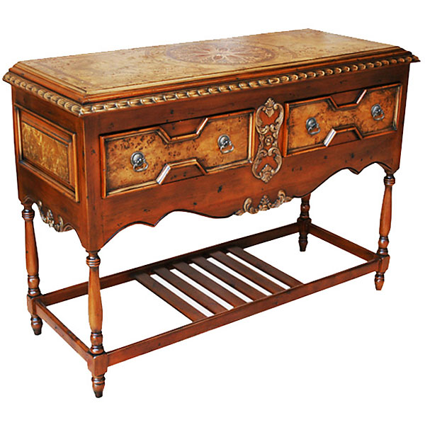 The Artalia Inlay Chest Console is a 43.5 wide beautiful 2 drawer chest. Featuring hand carvings and delicate inlays into rich burl surrounded by a hand carved Mahogany structure in a Vintage Estate (VE) finish. From the Heritage Collection of fine hand made furniture in the purest of standards of age old traditional crafting. Each piece is hand carved one piece at a time by some of the worlds best carvers. The special Mahogany wood used comes from replanted forests the selected wood has been kiln dried as well as the item in its final form is stress and pressure tested prior to finishing to insure long lasting stability in most all climates a Heritage Brand standard. The final steps of hand making furniture is the application of the beautiful hand applied finishes. The specialty finishes used combine hand applied layering glazing padding distressing and crackling techniques and complete the beauty and value of owning timeless Heritage Furniture a quality that will last for generations of ownership. This item would also pair perfectly with Artalia Inlay Coffee Table offered in the collection. Made by hand and imported from Indonesia.
