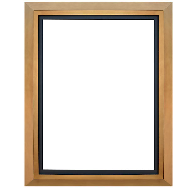 Interior size is 36 x 48 with an overall exterior dimension of 48 x 60 with a profile width of 6 and a profile height of 3.75 . Our Grand Float - Gold -Frame embraces a new aesthetic for gallery framers. Also referred to as a float technique where art is now placed as if freely floating with deliberate space evenly surrounding it. Our Grand Float with its clean angle yet raised projecting profile is a substantial option for creating this current and popular affect in modern gallery framing. The frame is solid wood with a relaxed angled outer edge finished in a striking outer gold leaf creating a dramatic contrast with an interior of black. This frame is available in many sizes and finishes. A FRAMERS CHOICE SELECTION !!!
