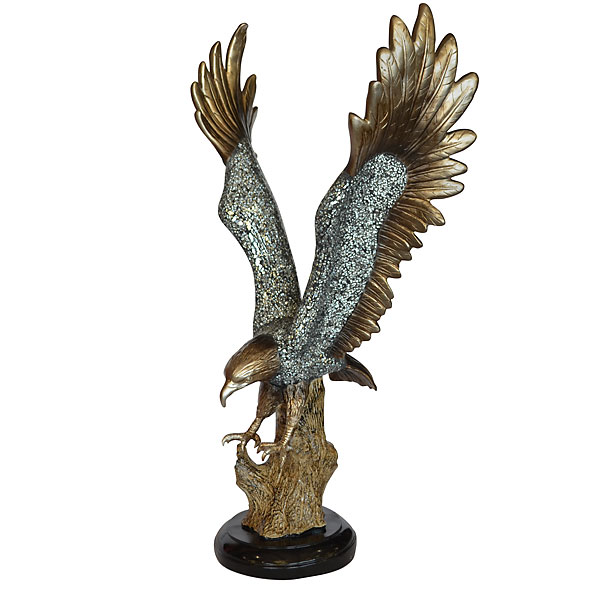 A 34 tall Eagle in a swooping down position rested on a trunk for stability. A modern artistic interpretation featuring hand applied micro mosaic mirrored elements with contrasting grout the wings and body are finished in a softer silver chiffon finish with golden hues. The item is hand cast in resin.