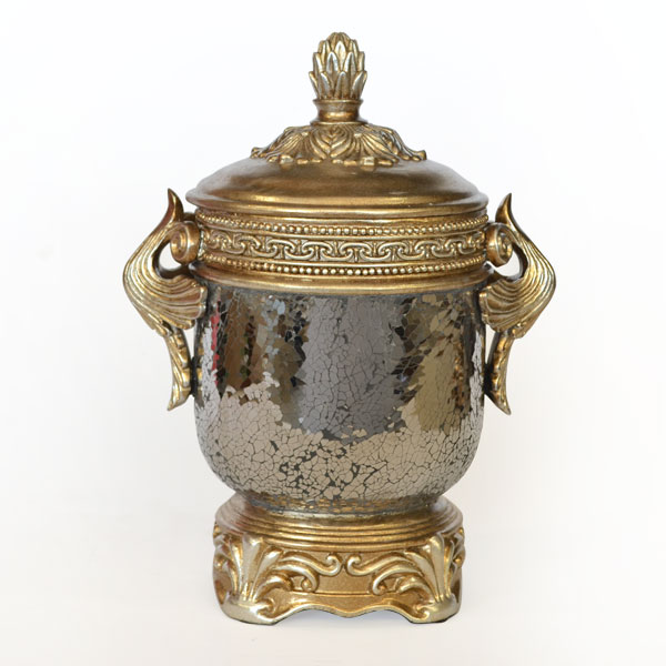 At 14.5 tall an opulent storage cannister jar or box with removable lid from our Mosaic Mirrored Collection. The item features ornate carved details surrounding hand applied micro mosaic mirrors with contrasting grout. The item is hand cast in resin and finished in a soft silver with golden hues. This item also would pair nicely with other items from this same collection.