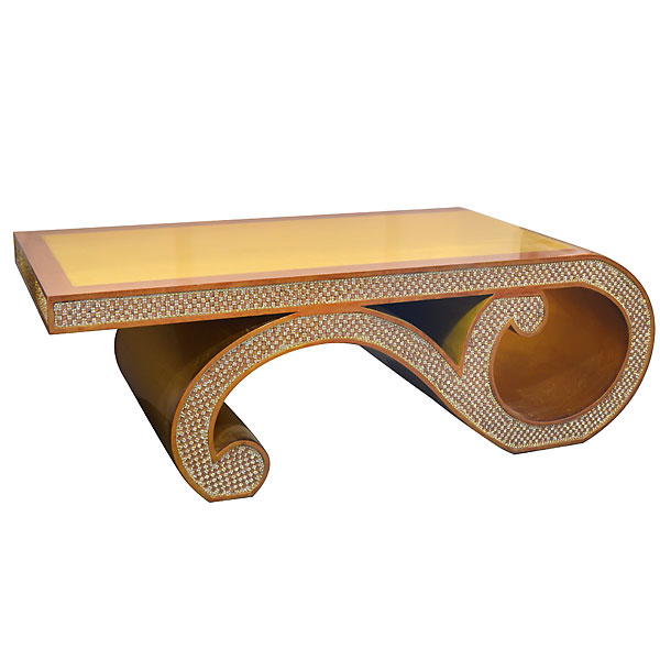 This modern furniture creation features both an unusual shape and 100's of individually hand applied elements or rose and clear rhinestones intermittently set. The finish is hand applied in varying tones of gold. The contrast and design create a very striking affect on this unique hand crafted functional art furniture item that will surely be a commanding item of attention in a proper interior setting . Hand made in mdf wood board utilized to insure long lasting stability in all climates