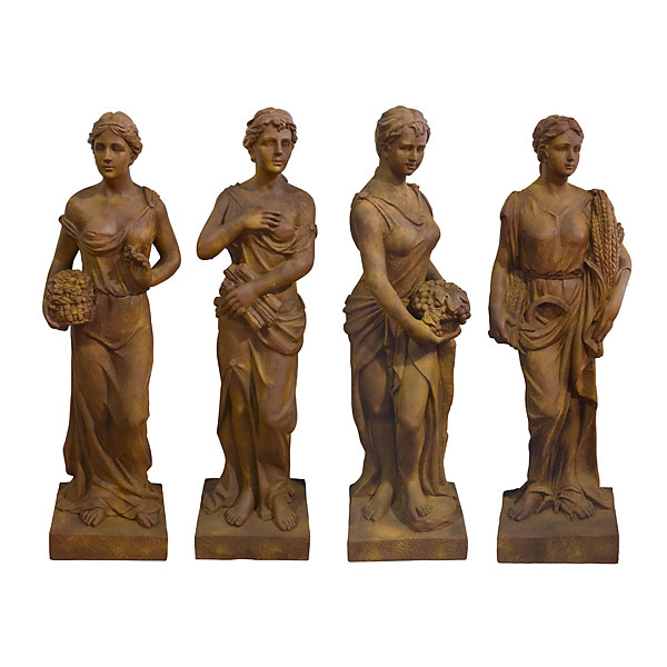 Our Antique Rust Four Seasons are a very popular selling set and offer a good value. They depict the classic Baroque style based on the finish and feel of antiques aged for years that would have originally been done in cast iron. The set features 4 individual robed goddesses heralding the 4 seasons each carrying a differrent element of their season. The set is hand cast in fiber glass reinforced resin the hand finishing is done in an Antique Rust appearing finish giving a timeless finished affect. . No assembly required. The material and finish are suitable for outdoor use but the finish is beautiful enough for interior use as well. Note* all products used outside will naturally wear depending on conditions and may require maintenance.
