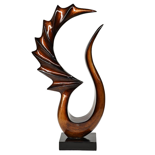 A large 20 wide x 38 tall abstract sculpture on stand from our Object of Art Collection. An affordable yet gallery quality collection featuring many shapes and sizes in a variety of finishes to accent modern decors. The Bulaga Art sculpture featured is from our beautiful Gradiant finish series. A series featuring a multi step artist applied finish with graduating tones of earthy umbers and siennas under a rich and lustrous laquerware top coat. The Art of Lacquerware is said to have originated in Japan many years ago when a prince on a battlefield happened to break off a branch and noticed a beautiful transparent sap began to flow which became hard and created a sublime radiance over what it touched. Perhaps how lacquer art was developed but soon not limited to japan as artists all over found value of enhancing objects through this lustrous top coat technique. Our artists today further expand on its abilities to enhance objects of art by applying many layers of delicate coatings with hand sanding between each as each step further enriches the final affect. The sculpture is hand cast in a durable fiberglass resin and sits atop an attached wooden base finished in a satin jet black.