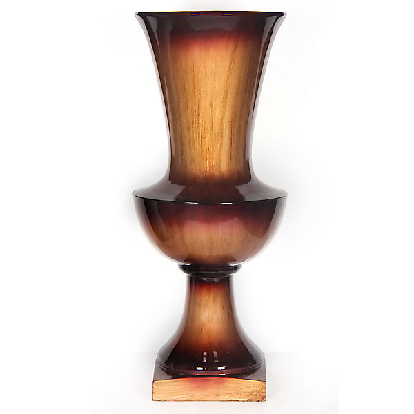 A 19 diameter x 47.5 tall transitional styled vase from our beautiful Gradiant finish Collection. A collection featuring a mutli step artist applied finish with graduating tones of earthy umbers and siennas under a rich and lustrous laquerware top coat. Sold seperatley but often ordered in pairs for balance and symmetry you may also consider ordering the smaller version of this style vase Gradiant Classic Vase also available. The Art of Lacquerware is said to have originated in Japan many years ago when a prince on a battlefield happened to break off a branch and noticed a beautiful transparent sap began to flow which became hard and created a sublime radiance over what it touched. Perhaps how lacquer art was developed but soon not limited to japan as artists all over found value of enhancing objects through this lustrous top coat technique. Our artists today further expand on its abilities to enhance objects of art by applying many layers of delicate coatings with hand sanding between each as each step further enriches the final affect. The vase is hand cast in a fiberglass resin which is durable and can withstand outdoor applications. The finish however is not recomended for outdoor use unless maintained with protective laquer top coatings. The frequency of which will depend on your specific conditions.