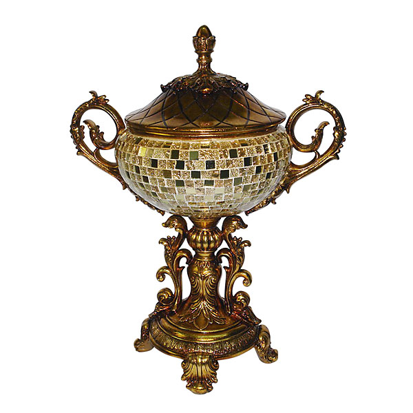 A 25.5 tall unusual shaped center bowl with removeable lid on classic carved stand Hand cast in resin with antiqued gold handles base and accents. This dramatic item from our Mirazzo collection features individually applied Mirazzo designed glass tiles. The tiles are created with a reverse applied gradiant gold foil. Creating a transclucent and graduated striking affect. While the finished result is quite dramatic it is equally as functional.
