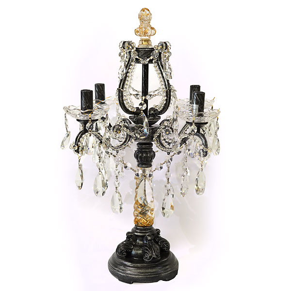 At 12 wide and 22 tall this petite but very intricate lamp features beautiful glass crystal elements. Each arm is hand wrought in iron and decorated with clear cabachon beads holding clear bobeches supporting the illuminating candle lights. The center of lamp features added design elements of iron and clear glass supported by a hand antiqued burnished base. The item is UL listed and uses 4 standard E 12 candle bulbs . Bulbs are not included. You may also consider using 1 or 2 of these beautiful lamps for a complete room setting with balance.