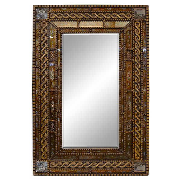 Peruvian Reverse Serpentine Mirror is 48 wide and 71 tall it features rich varying sienna and gold tones creating depth and contrast in this reverse painted art mirror. Set into an angled and mutli reflective with silvered mirror corners and a carved serpentine design carved frame. The technique used embodies an art form developed hundreds of years ago in the small villages of the Andes mountains. The artists were able to create colorful objects utilizing indegenous vegetable and plant based colors. The techniques evolved over the years from generation to generation and expanded to painting hides and pottery it was later discovered that by using this technique and by painting on the reverse side of glass that the colors and designs where even more beautifully magnified. Today they are even further enriched by backing the painting panels with gold and silver leaf foils. We offer many color options in these fine and very popular authentic Peruvian mirrors for you to choose from and while there are many copies created in less quality trying to copy the original techniques none are found as beautifull as those offerred under our Santa Lucia Collection. A hand made treasure and an investement in a quality art form to be cherished for generations to come.