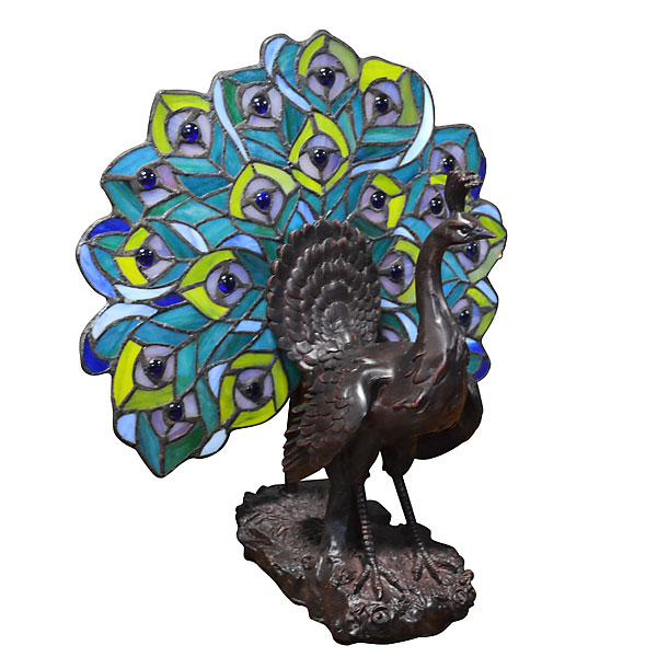 FROM OUR TIFFANY COLLECTOR'S SERIES !! A very unique illuminated sculpture lamp featuring the popular Peacock with its swash of feathers crafted in leaded and jeweled colorful glass sit in front of an ambient light. Lamp features an Iron and Polyresin base with shade materials of Glass Copper and Lead. The lamp weighs 6.6 lbs. Bulb 1 E12 40 watt not included. Item is UL listed 110 volt and item features an on off switch. Inspired by the designs of Louis Comfort Tiffany. A great American artist best known for his work in stained glass and his association with the Art Nouveau and Aesthetic movements. Tiffany was affiliated with a group of American designers of the time known as the Associated Artists. These artists brought recognition to the Americas from Europe and World who finally recognized the talent and this original American Art form. We are proud to carry on the tradition and offer this quality Functional Art Collection by making them available and affordable to the public and not just viewed in Museums or hidden in collectors vaults.