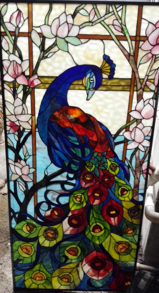 Peacocks in design our found everywhere their iridescent feathers and decadent beauty inspire decorative beauty. In India where peacocks originally come from they were a symbol of royalty. The peacock continued as a favored motif into the Art Nouveau era and Louis Comfort Tiffany used the iridescence to emphasize the decadent aspect of the bird's exquisite beauty. Peacocks remain a popular motif today as both design image and as a representation of nature. Window materials are Glass Copper and Lead. Inspired by the designs of Louis Comfort Tiffany. A great American artist best known for his work in stained glass and his association with the Art Nouveau and Aesthetic movements. Tiffany was affiliated with a group of American designers of the time known as the Associated Artists. These artists brought recognition to the Americas from Europe and World who finally recognized the talent and this original American Art form. We are proud to carry on the tradition and offer this quality Functional Art Collection by making them available and affordable to the public and not just viewed in Museums or hidden in collectors vaults.