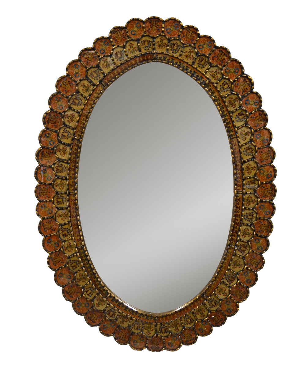 Peruvian Reverse Scalloped Oval Mirror is 41 wide and 58 tall it features rich varying sienna umber and gold tones creating depth and contrast in this reverse painted art mirror. Set into a scalloped edge carved oval wood frame. The technique used embodies an art form developed hundreds of years ago in the small villages of the Andes mountains. The artists were able to create colorful objects utilizing indegenous vegetable and plant based colors. The techniques evolved over the years from generation to generation and expanded to painting hides and pottery it was later discovered that by using this technique and by painting on the reverse side of glass that the colors and designs where even more beautifully magnified. Today they are even further enriched by backing the painting panels with gold and silver leaf foils. We offer many color options in these fine and very popular authentic Peruvian mirrors for you to choose from and while there are many copies created in less quality trying to copy the original techniques none are found as beautifull as those offerred under our Santa Lucia Collection. A hand made treasure and an investement in a quality art form to be cherished for generations to come.