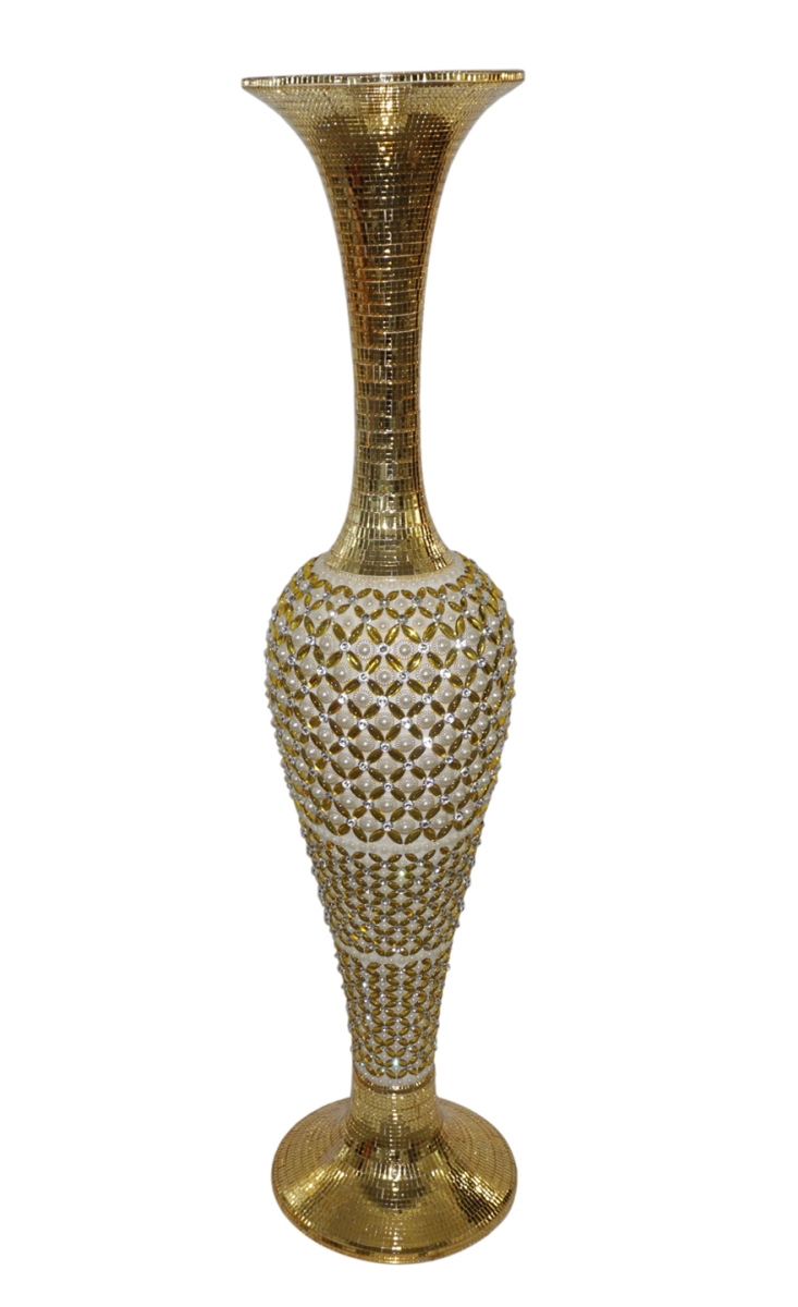 At 47.5 tall this dramatic modern vase is certainley one of our most aggressive hand made vases offerred. Stunningly adorned by hand with 1000's of gold mirrored slivered tiles and clear Rhinestones . This major presentation vase is sure to grab the focus of any decorative application it is placed in. The vase is hand cast in very strong poly fiber construction that enabled the artist to work the shape of the structure before the countless hours of hand applying finished thier creation.