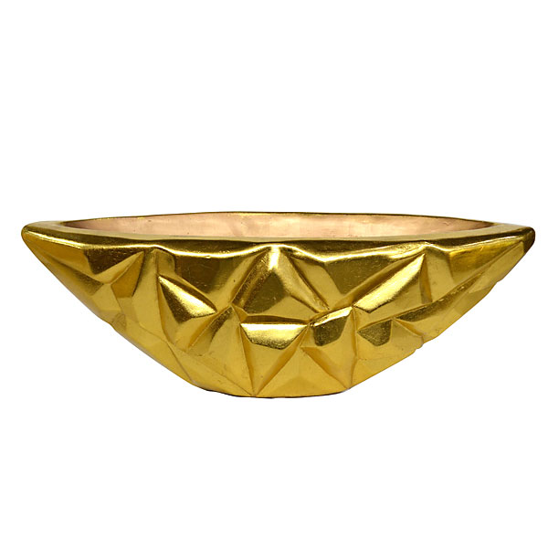 A contemporary style large centerpiece at 32 wide from our Oro finish collection. A large collection featuring many beautiful shaped and functional items all with clean lines but very much a collection with an emphasis on scale and drama. The vase is hand cast in a fiberglass resin which is durable and can withstand outdoor applications. The hand applied gold leaf finish is further protected with an enriching laquer top coat. The finish however is not recomended for outdoor use unless maintained with protective laquer top coatings. The frequency of which will depend on your specific conditions. This beautiful decorative item is not for food use.