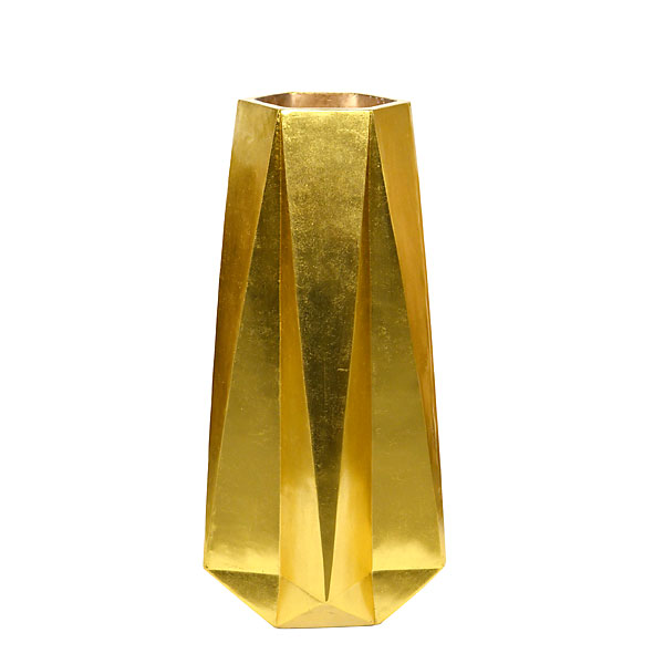 A large contemporary designed vase standing 21 diameter x 39.75 tall in a vibrant gold leaf finish from our Oro finish collection. The Oro Finish is a large collection featuring many beautiful shaped and functional items all with clean lines but very much a collection with an emphasis on scale and drama. Sold seperatley but often ordered in pairs for balance and symmetry. The vase is hand cast in a fiberglass resin which is durable and can withstand outdoor applications. The hand applied gold leaf finish is further protected with an enriching laquer top coat. The finish however is not recomended for outdoor use unless maintained with protective laquer top coatings. The frequency of which will depend on your specific conditions.