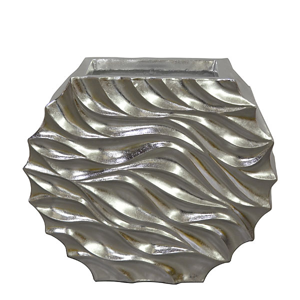 A very large contemporary designed round vase standing 31.5 wide x 12 deep x 28 tall in a vibrant gold leaf finish f from our Argento finish collection. A large collection featuring many beautiful shaped and functional items a collection with an emphasis on scale and drama. This item pairs nicely with many items from this collection to create a more complete and larger functional and visual display. The vase is hand cast in a fiberglass resin which is durable and can withstand outdoor applications. The hand applied gold leaf finish is further protected with an enriching laquer top coat. The finish however is not recomended for outdoor use unless maintained with protective laquer top coatings. The frequency of which will depend on your specific conditions.