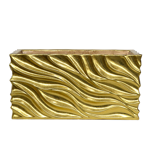 A 31.5 wide x 12 deep x 16 tall rectangular box vase in a contemporary all gold leaf finish from our Oro finish collection. The Oro Finish is a large collection featuring many beautiful shaped and functional items all with clean lines but very much a collection with an emphasis on scale and drama. Sold seperatley but often ordered in pairs for balance and symmetry. The planter box is hand cast in a fiberglass resin which is durable and can withstand outdoor applications. The hand applied gold leaf finish is further protected with an enriching laquer top coat. The finish however is not recomended for outdoor use unless maintained with protective laquer top coatings. The frequency of which will depend on your specific conditions.