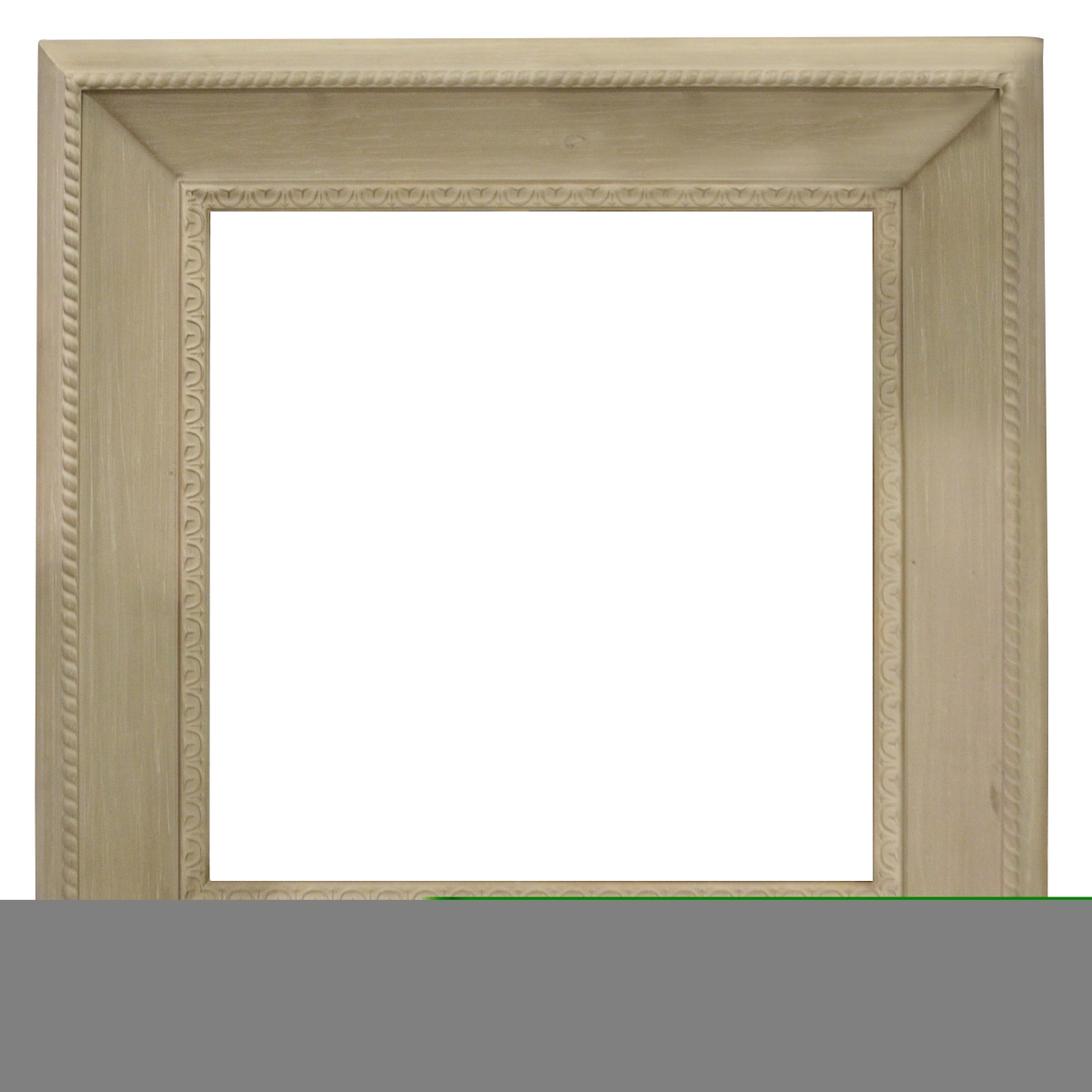 Interior size is 30 x 30 with an overall exterior dimension of 46 x 46 with a profile width of 8 and a profile height of 3.25 . Our Seasoned Grand Frame - 071 is a large frame profile made in wood with attached wood liner. It is available in 2 seasoned wood finishes both of which embody some of the most popular trends of tones used in todays current interiors. The frame design features a swooping contoured profile that works to draw the eye inward and showcases the subject of the frames use. This finish is the 071 and is the lighter version it has a bleached wood tone with hand applied beige wash with an added textured technique creating a beautiful all over finish. For applications requiring a darker tone consider our new Seasoned Grand Frame-071. A FRAMERS CHOICE SELECTION !!!
