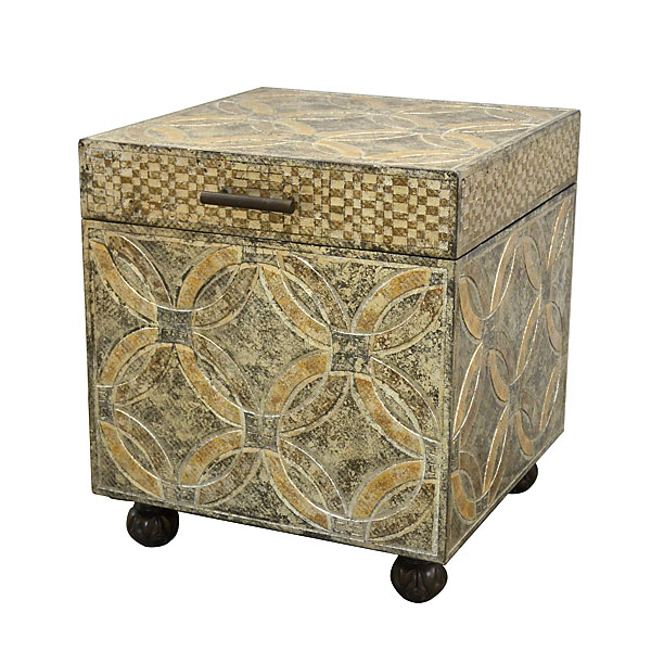 This piece set features a an modern encircled diamond design - Natural colors are enhanced with hints of gold -the lid opens for a great storage and has a safety hinge for keeping it open when necessary ? sits on 4 ball shaped legs can be used as a side table or trunk