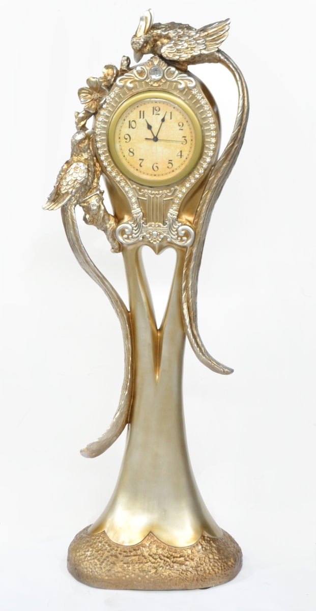Our Parrot Floor Clock is large at 17 wide x 17 deep x 52 tall. This standing floor clock is a very unique design that will surely grab attention. The original master was hand carved and cast in a durable Polyresin. The finishing is elegant with a silver base and hand highlighted with golden hues of umber that draws the details and creates a blended overall rich affect further enhanced with the application of Rhinestone jewels . The clock is battery operated. It comes fully assembled.